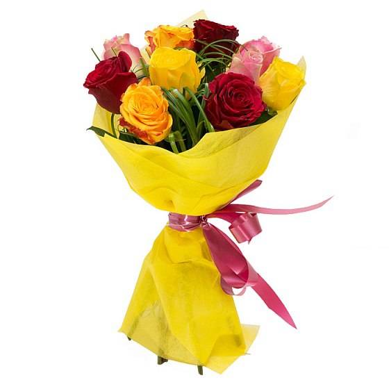 Ассорти из желтых, оранжевых, розовых и красных роз – оригинальный, яркий и своеобразный букет. Данное разнообразие цвета и смысла в данной композиции говорит об оригинальности. Также этот букет может свидетельствовать о том, что дарителя переполняют самые разные чувства, глубину и силу которых очень сложно выразить словами.